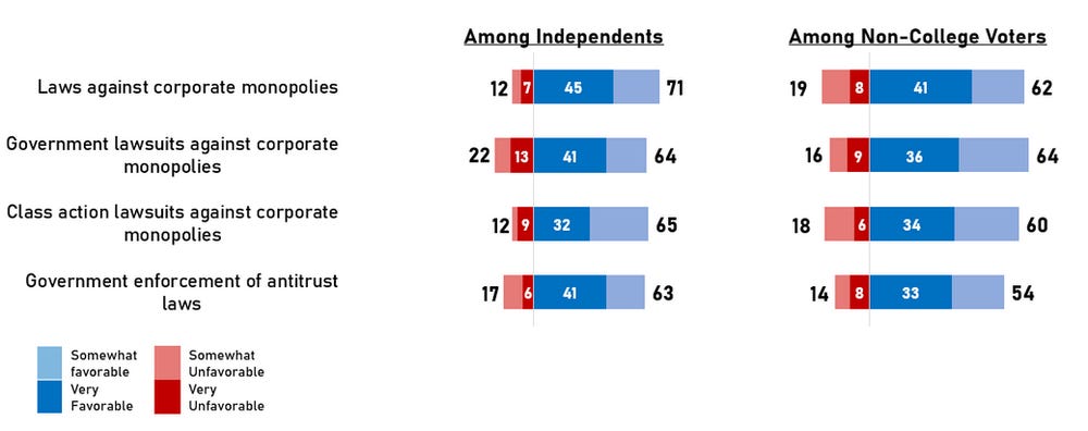 Another notable thing about this poll was that we didn’t have to explain concepts like monopoly power to people. The voters surveyed immediately understood, related to, and responded positively to different remedies for corporate power that they found problematic.